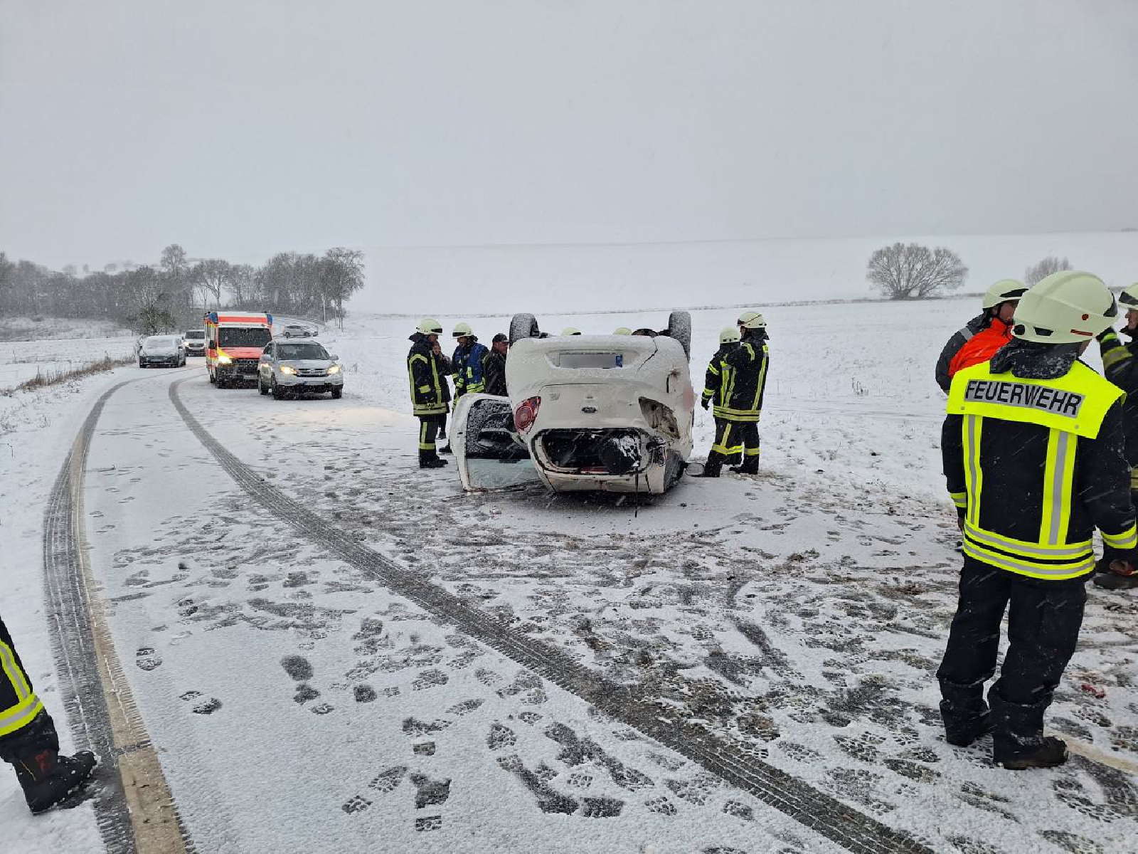 Aufgrund der Witterungsverhältnisse hatte sich dort ein PKW überschlagen und