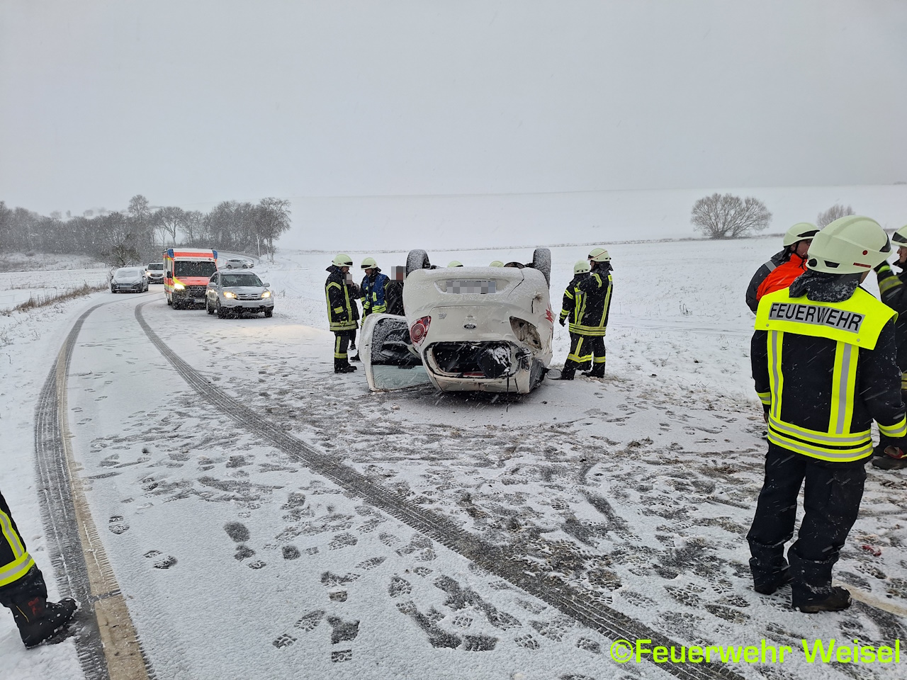 Aufgrund der Witterungsverhältnisse hatte sich dort ein PKW überschlagen und blieb auf dem Dach liegen.